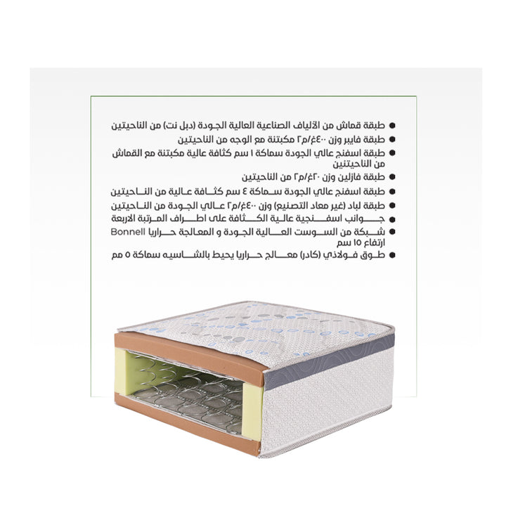 • شاسيه Bonnell Springs سوست متصلة معالجة حراريًا بارتفاع 15 سم لتوفير دعم متوازن وثابت.