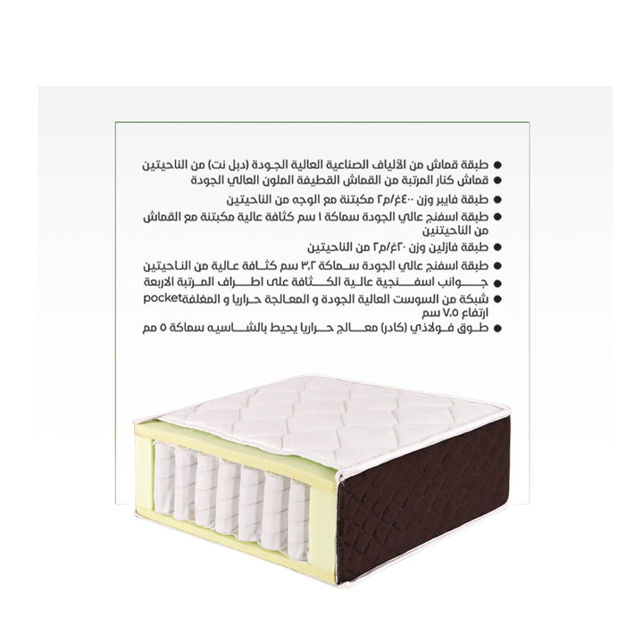 • نظام سوست منفصلة (Pocket Springs) مغلفة ومعالجة حراريًا بارتفاع 7.5 سم لامتصاص الحركة وتوفير دعم مستقل لكل منطقة من الجسم.