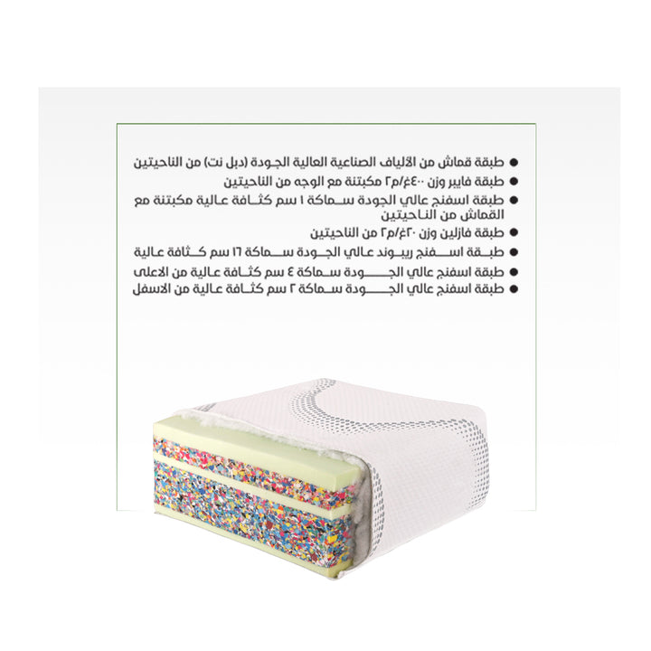 • نواة إسفنج مضغوط (ريبوند) سماكة 10 سم بكثافة عالية لراحة ودعم طبي مثالي.