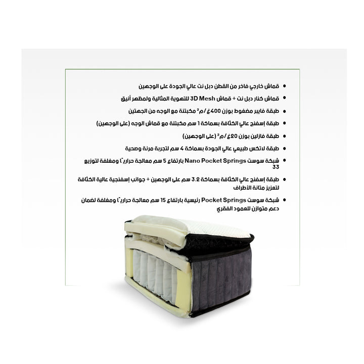 • شبكة سوست Nano Pocket Springs: ارتفاع 5 سم – معالجة حراريًا ومغلفة لتوزيع مثالي للوزن