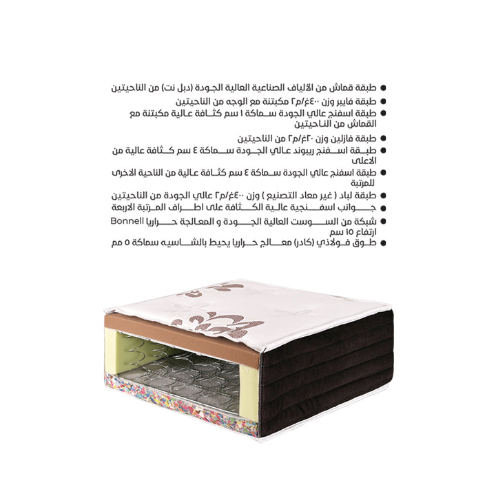 • نظام سوست متصلة Bonnell Spring بارتفاع 15 سم ومعالجة حراريًا لمتانة وثبات دائم.