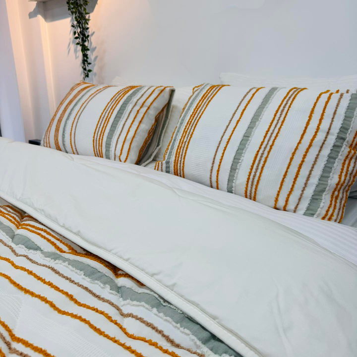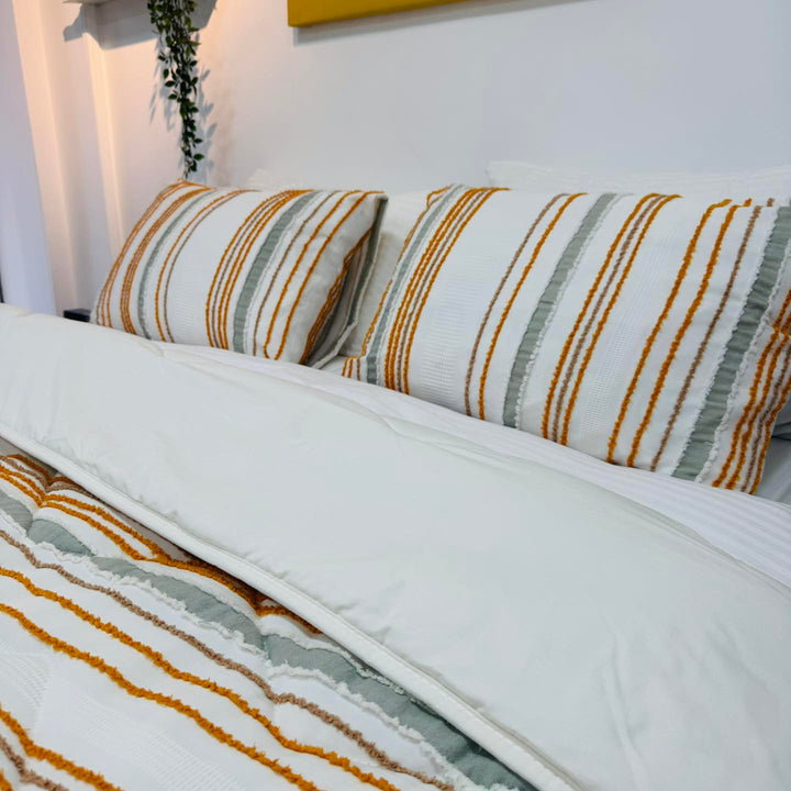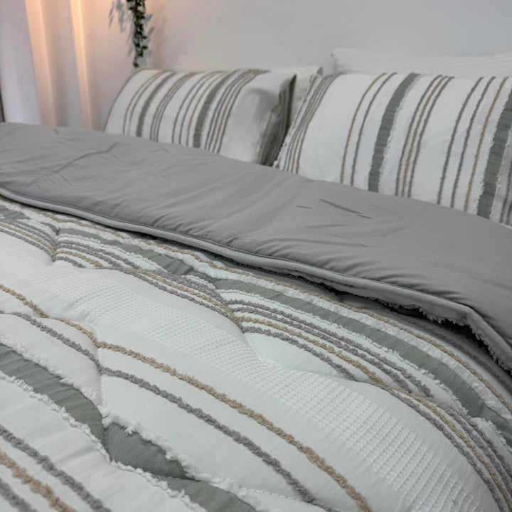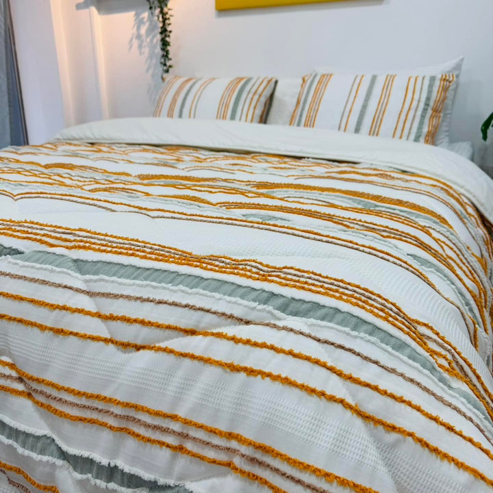 تجمع هذه الكوفرته بين الخامة القطنية المريحة والتطريز البارز الأنيق لتمنحك شعورًا بالفخامة والراحة في آن واحد.